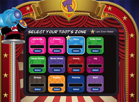 We've had such a great response from everyone and now Tootsville is expanding! We're adding new servers to make the website bigger, so we can accomodate all the new members. Now you'll be able to select which zone you'd like to play in. The zones are named after the patterns on the Toots (some patterns you won't recognize, because these are for new Toots we'll be introducing soon!). For example, you and all your friends could agree to meet in Tootsville at the "Hearts" zone! We've also included a feature that shows you how full each zone is. There are lots of new and exciting things happening around here, so keep checking back to be part of it all!